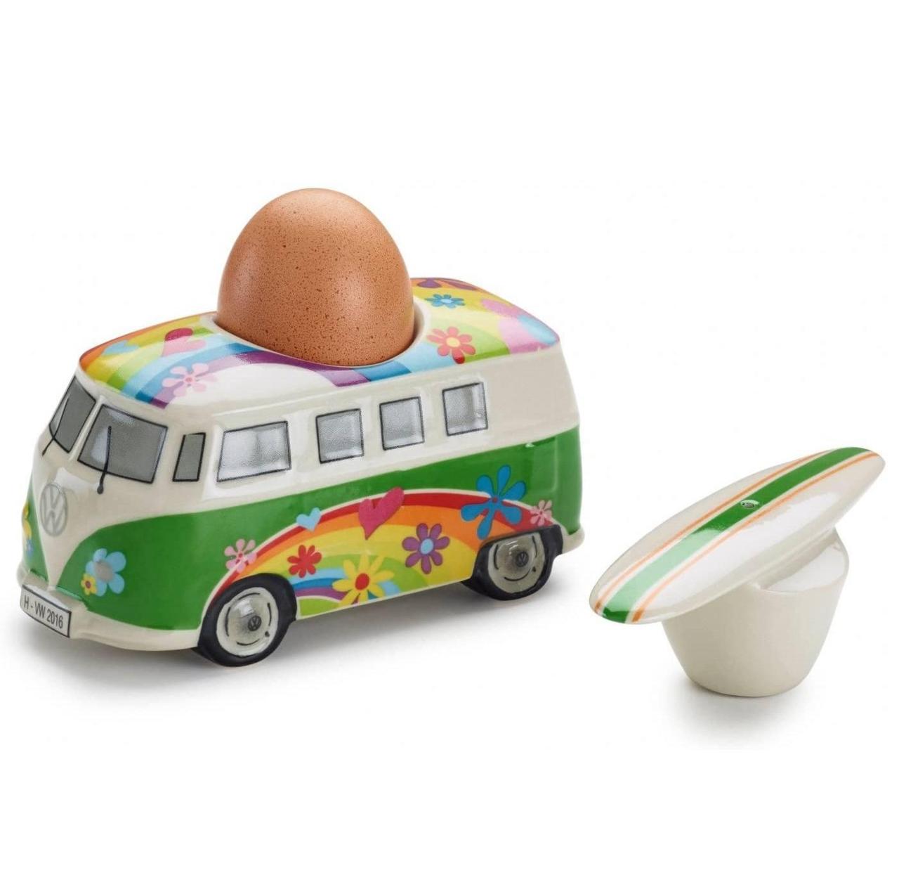 Насолоджуйтесь сніданком! Фарфорова підставка для яєць некруто в формі популярного в 60-70-і роки історичного автомобіля Volkswagen Т1 Bulli. Кришка виконана в формі дошки для серфінгу, але вона одночасно є і сільницею! Оригінальна життєрадісна квіткова забарвлення додасть позитивних емоцій за прийомом їжі! Розмір: 130 x 65 x 65 мм. Артикул: 211069644A AUN