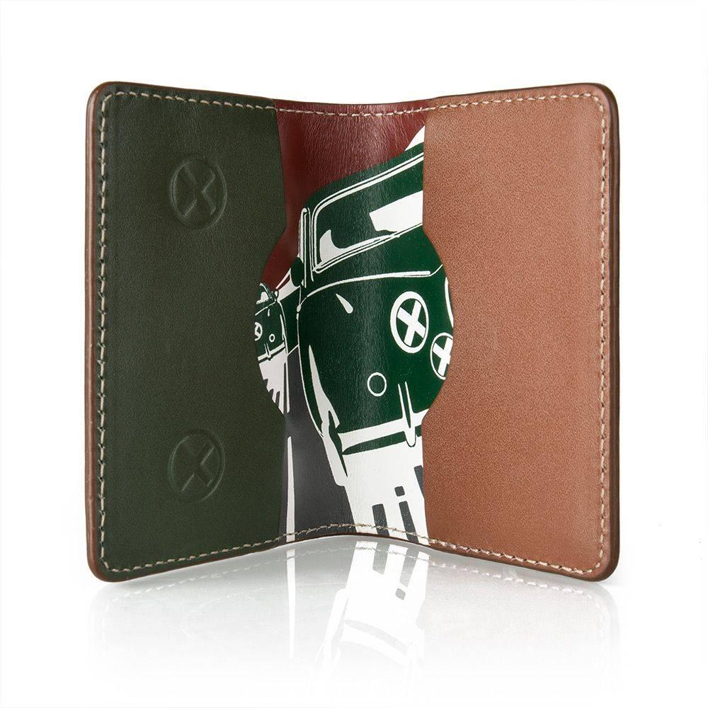 Візитниця і гаманець з динамічним малюнком автомобіля Jaguar Mark II на внутрішній стороні і деталями в стилі фар X-Headlight. З тисненим ромбоподібним логотипом Heritage. Матеріал: 100% шкіра.